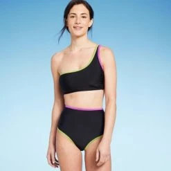 Women’s Contrast Binding One Shoulder Bralette Bikini Top – Shade & Shoreâ„¢ Black