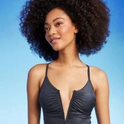 Women’s Shirred V-Wire Plunge One Piece Swimsuit – Shade & Shoreâ„¢ Gray