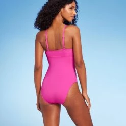 Soak up the summer sun in standout style wearing this Center-Front Shirring One-Piece Swimsuit from Shade & Shore™. This hot pink one-piece swimsuit designed to offer medium coverage features a deep V-neck, ring accents on the straps and front shirring for a flattering look. Made from soft and stretchy fabric, it offers flexible comfort in and out of the water. The removable padded cups offer customizable coverage and support, and the adjustable straps make it easy to find just the right fit.