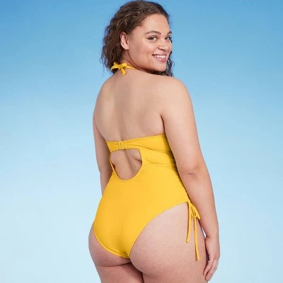 Add some fashion to your swim closet with this Functional Cinch Side One-Piece Swimsuit from Shade & Shore™. This one-piece swimsuit in light gold features functional cinched sides, a keyhole back and a flattering high-leg style. Made from stretchy fabric with elastic at the leg openings, the swimsuit provides comfortable movement and wear. The removable padded cups offer customizable coverage and support, plus the behind-the-neck halter tie makes it easy to find the perfect stay-put fit.