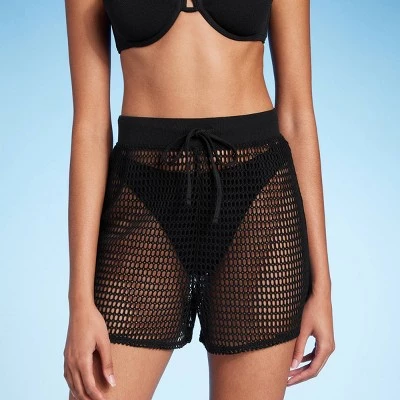 Refresh your vacay wardrobe with these Pull-On Crochet Cover-Up Shorts from Shade & Shore™. Made from 100% recycled polyester, these cover-up shorts boast an elegant black hue adorned with a charming crochet pattern. The pull-on design with a ribbed waistband and drawstring completes the look with a customizable fit.