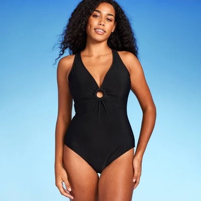 Elevate your swim style with this Ribbed Plunge Over-the-Shoulder One-Piece Swimsuit from Shade & Shore™. This medium-coverage swimsuit in a solid hue features an allover ribbed design with a plunging V-neckline and a keyhole detail to add peek-a-boo flair. Made from stretchy fabric with elastic at the leg openings, it offers ease of movement in and out of the water. The crisscross back with adjustable tie straps makes it easy to find just the right fit, and the removable padded cups offer customized coverage.
