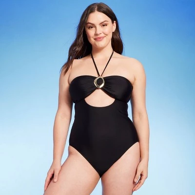 Add timeless flair to your swimwear collection with the Ring-Front Halter Bandeau One-Piece Swimsuit from Shade & Shore™. This black one-piece swimsuit features a halter-neck design with a ring front and a keyhole detail to elevate the look. Made with soft and stretchy fabric with full lining, it helps you stay comfy in and out of the water and provides medium coverage. It’s designed with removable cups for customizable coverage and closes with back hooks for a secure fit.