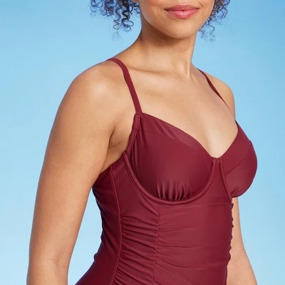 Add amazing color and style to your swim closet with the Shirred Balconette Underwire One-Piece Swimsuit from Shade & Shore™. This burgundy one-piece swimsuit is designed in balconette style, and features shirring at the front for a boost of flair. Offering full coverage, this balconette one-piece swimsuit is made with soft and stretchy fabric to help you stay comfy in and out of the water. Best of all, it’s designed with underwire and removable cups for customizable coverage.