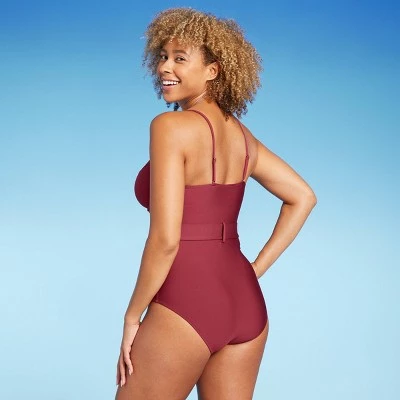 Elevate your swimwear for sunny excursions to the beach with this Underwire Belt One-Piece Swimsuit from Shade & Shore™. This one-piece swimsuit in a solid red color is designed to offer medium coverage. It features a supportive underwire design that comes with a matching round buckle belt on the waist for chic cinched-in style. The stretchy fabric provides easy movement, and the open back with adjustable straps makes it easy to find just the right fit. Plus, the removable padded cups offer customizable coverage.